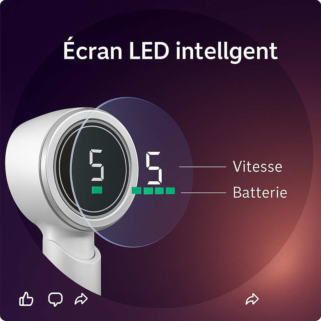 Super simple ! Un bouton unique pour choisir votre niveau de fraîcheur idéal. De la brise légère à la ventilation intense, adaptez-vous instantanément à la température.